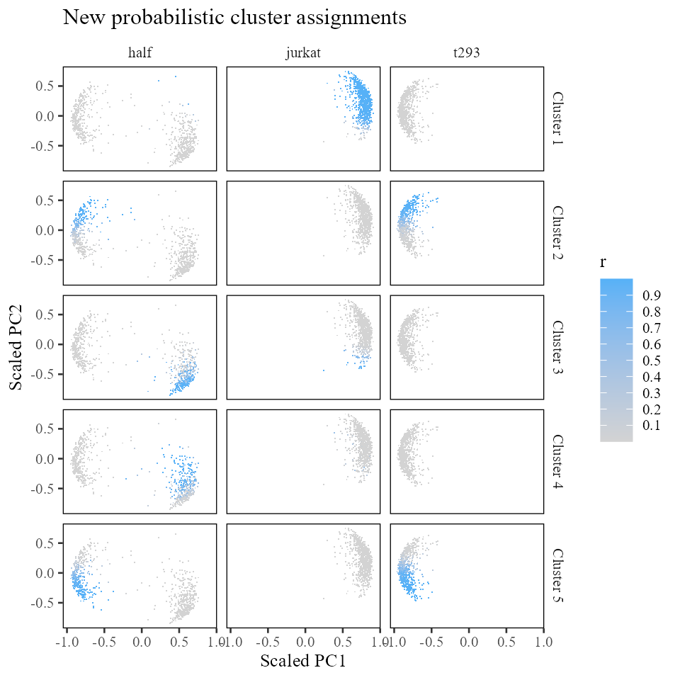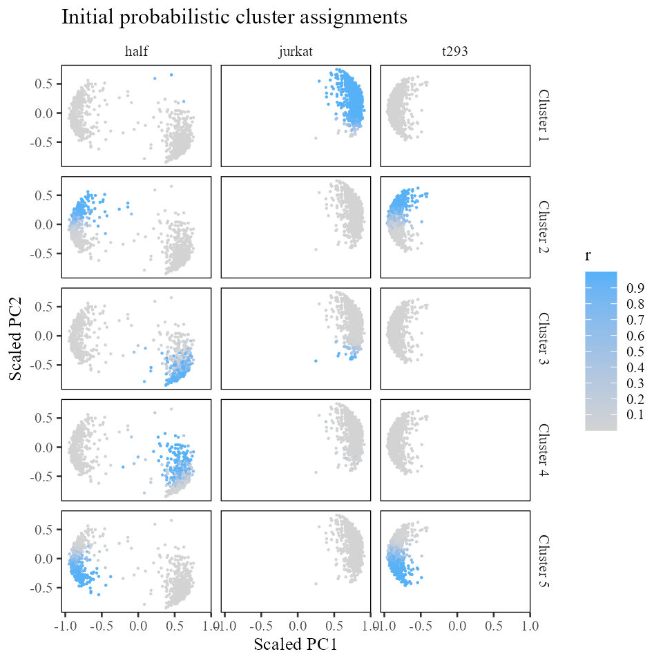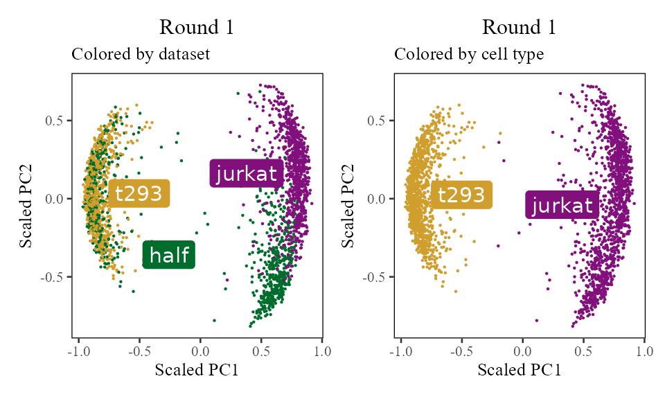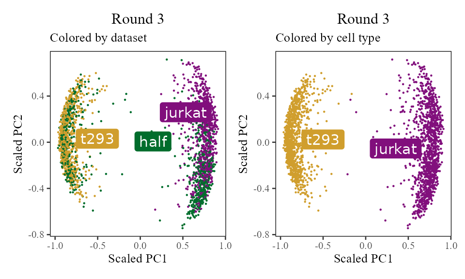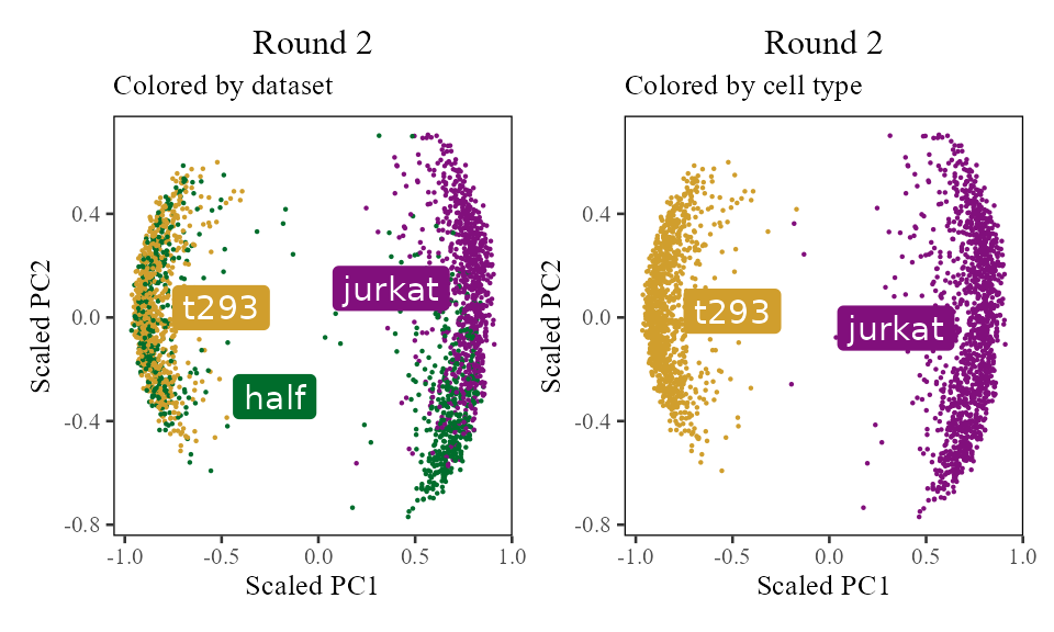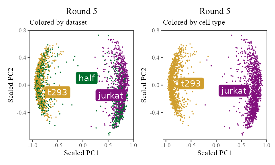 labs(title = sprintf('Round %d', i), subtitle = 'Colored by cell type', x = 'Scaled PC1', y = 'Scaled PC2') +