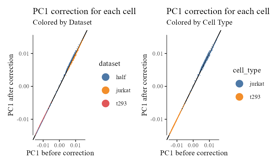 After correction, we remove the batch specific terms (colored arrows above). We can see the result in the corrected linear space (). Notice that now, the cells are centered around the tips of the black arrows, which represent the intercept term. This is because we’ve removed the effect of the batch terms (colored arrows).