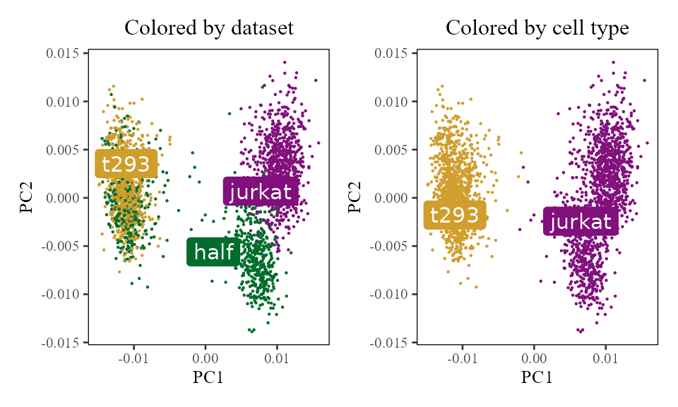 meta_data <- cell_lines$meta_dataTo get a feel for the data, let’s visualize the cells in PCA space. The plots below show the cells’ PC1 and PC2 embeddings. We color the cells by dataset of origin (left) and cell type (right).