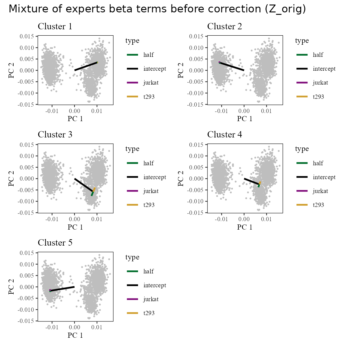 patchwork::plot_annotation(title = 'Mixture of experts beta terms before correction (Z_orig)') +