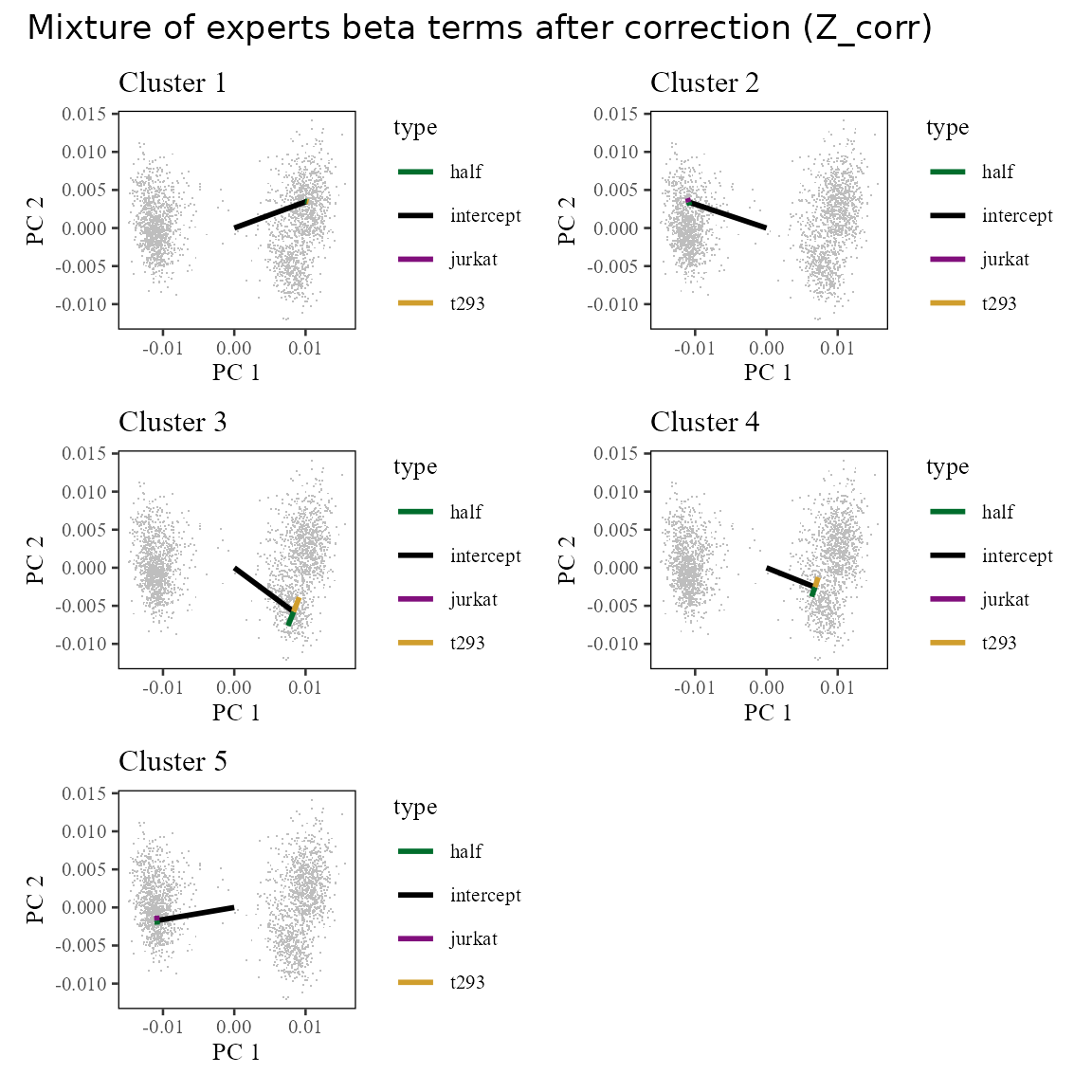 patchwork::plot_annotation(title = 'Mixture of experts beta terms after correction (Z_corr)') +