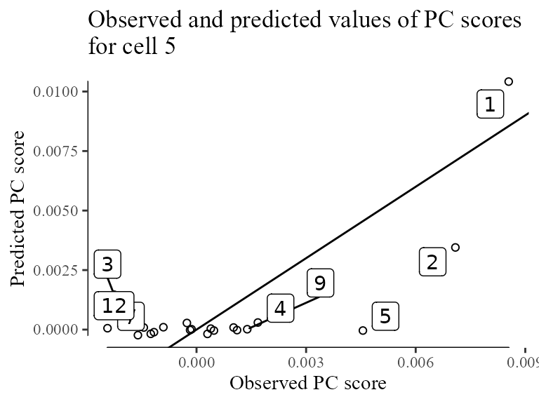 labs(x = 'Observed PC score', y = 'Predicted PC score', title = 'Observed and predicted values of PC scores\nfor cell 5') +