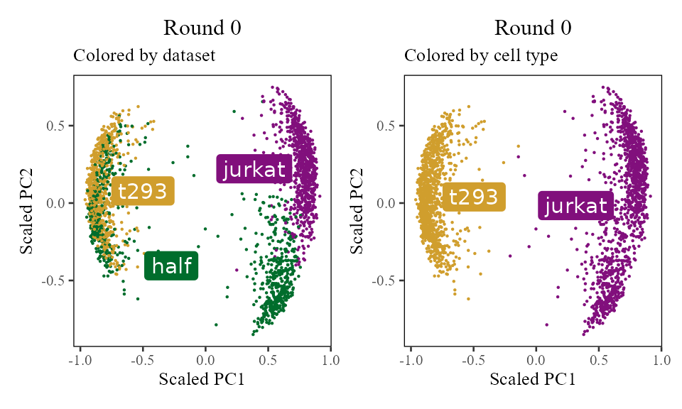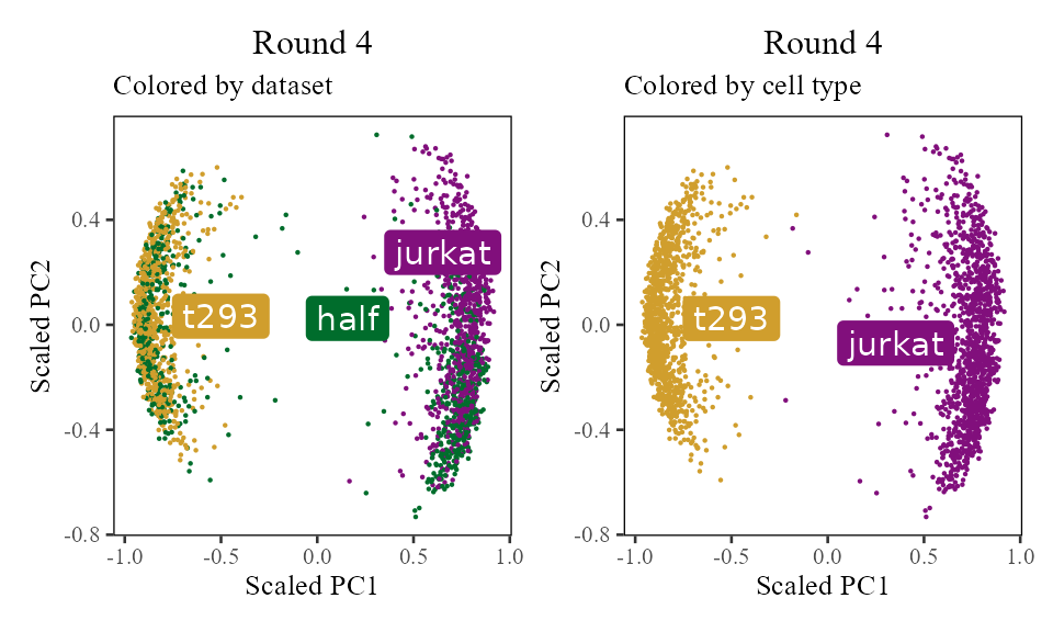 labs(title = sprintf('Round %d', i), subtitle = 'Colored by dataset', x = 'Scaled PC1', y = 'Scaled PC2') +