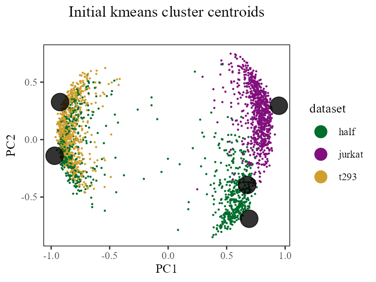The sections above broke down the Harmony algorithm. Now’s let’s take a more holistic look. In the code below, let’s look at the corrected PC values () after each round of Harmony (clustering + correction). Since we’re not visualizing the clusters in this section, let’s increase nclust to 50. After the 1st and 2nd rounds, we can see considerably more mixing. By round 3 though, the cells are pretty well mixed and we stop.